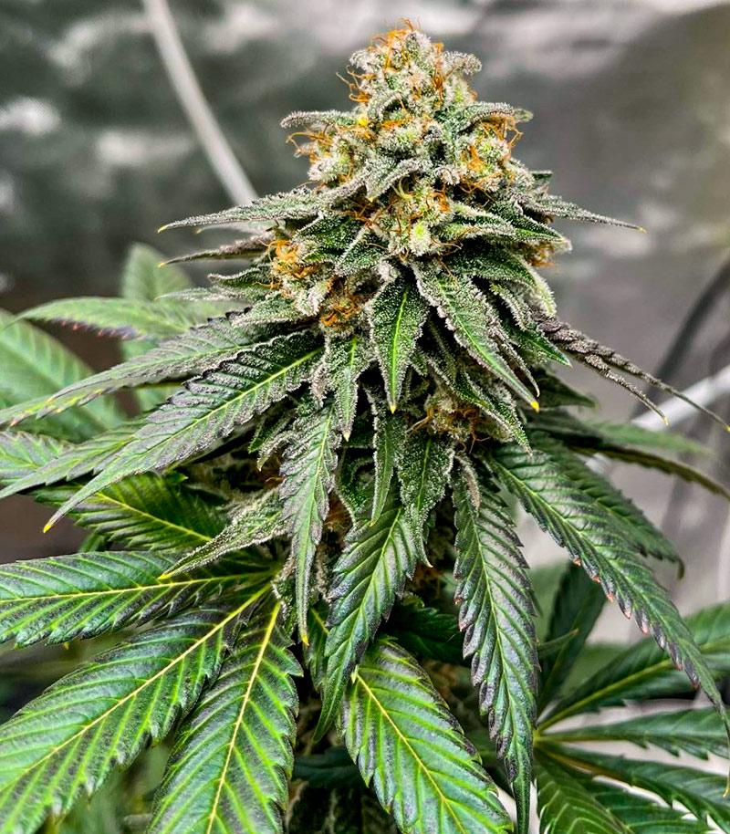 Где-то за 3 недели до сбора урожая сдержанная палитра окраса куста разбавляется утонченными оттенками темно-фиолетовых цветов. Оторвать взгляд от подобной картины достаточно сложно, особенно если учесть, как красиво играют бликами темные цвета крупных чашечек в преломлении света от белых трихом. Идеальный сорт для экстракции.