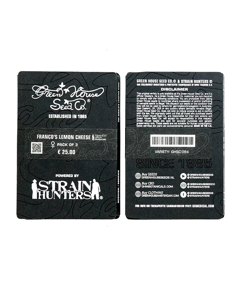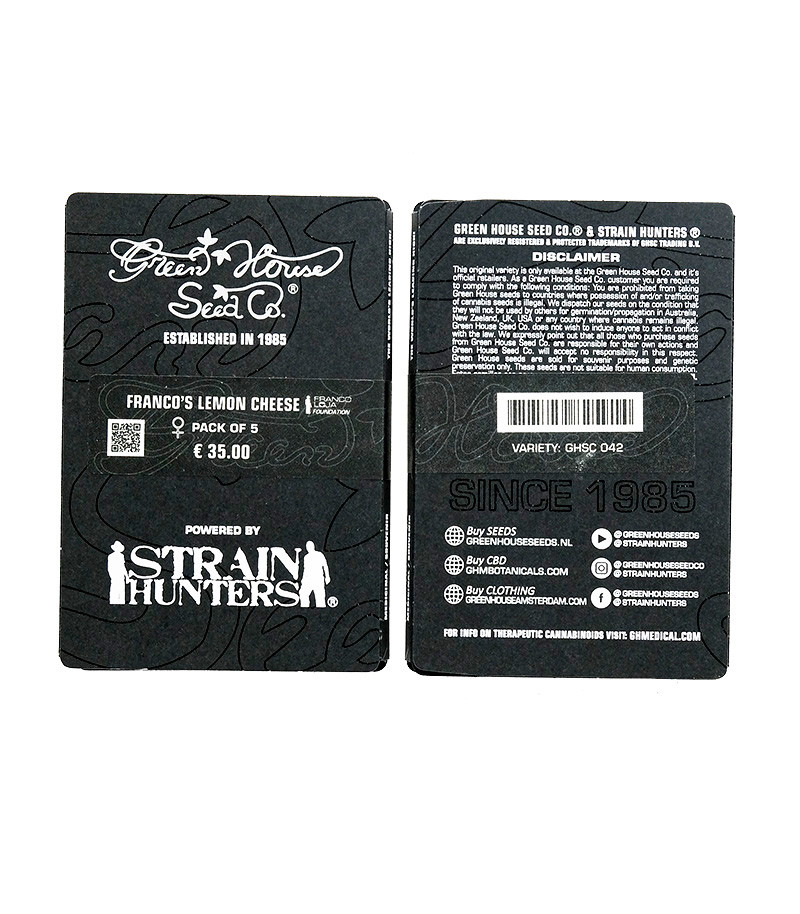 Franco's Lemon Cheese – феминизированный сатива доминантный гибрид с ТГК более 23,50%. Green House Seeds – посвятил его памяти Франко Лоя. Урожай в индоре – 800 г/м2, в ауте – 800 г/куст. Подходит для грунта и гидропоники. Хорошо реагирует на SCROG или LST. Эффект сильный энергичный социальный хай.