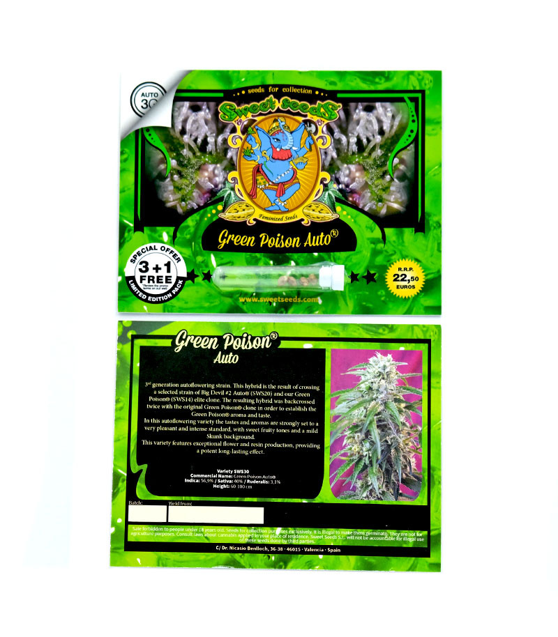 Green Poison Auto ("Зеленый яд") - автоматическая версия популярного сорта Green Poison третьего поколения, славящегося необычайно долгим и изысканным вкусом. Бридерам удалось сохранить свойства оригинального сорта, придав ему автоматические качества.