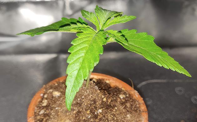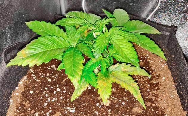 За первую неделю растишка достигла высоты в 6 сантиметров и успела сформировать две пары здоровых листьев. На второй неделе была осуществлена пересадка в тканевый горшок на 17 литров, в котором растение останется вплоть до харвеста. Скорее всего, при пересадке что-то произошло, потому что к концу недели на двух листьях появились пятна, причем только на них.